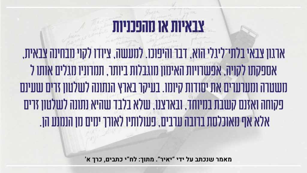 אברהם “יאיר” שטרן (1907–1942), היה מייסדו ומפקדו הראשון של ארגון לוחמי חרות ישראל (לח”י). הוא נולד בפולין, התחנך בסביבה יהודית־עברית והושפע מלימודים קלאסיים, מן הספרות האירופית ומן המקורות היהודיים. לאחר עלייתו לארץ ישראל היה פעיל ב”הגנה” ובאצ”ל, ובשנת 1940, על רקע מחלוקת עקרונית בשאלת המאבק בבריטניה בזמן מלחמת העולם השנייה, הקים את לח”י. שטרן עמד על הצורך במלחמת שחרור רצופה נגד השלטון הבריטי, עד להקמת ריבונות עברית.